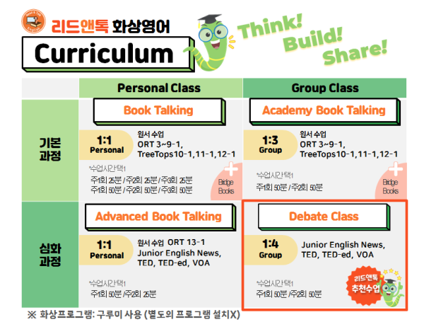 Bridgebook인 다독교재로 수업한 이후 Debate 클래스에 참여하는 것을 권장드립니다.